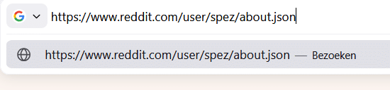 Open een nieuw tabblad. Voer in de adresbalk onderstaande URL in waarbij je REDDITGEBRUIKERSNAAM vervangt door de Reddit gebruikersnaam die je onderzoekt.