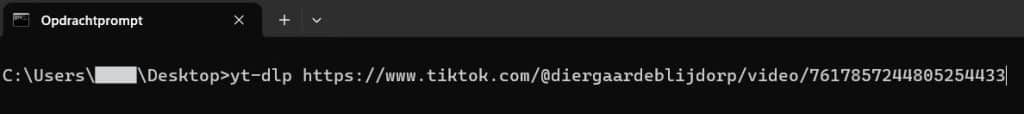 Open de command-line-interface van je systeem. In dit geval gebruiken we de Opdrachtprompt op een Windows-apparaat. Tik daar vervolgens het command yt-dlp in gevolgd door de URL van de TikTokvideo die we net hebben gekopiëerd. Druk dan op enter.