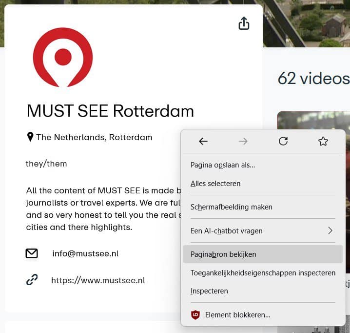 Klik met de rechtermuisknop op het Vimeo profiel dat je onderzoekt en klik op Paginabron bekijken.